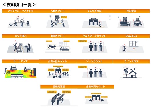 監視やマーケット分析などの用途に合わせ、14の検知項目から選択、運用できるのが特徴で、既存の監視カメラシステムにも導入可能です。また、追加ライセンス(有料)により、その他数十種類のアプリケーションを選択することができます。