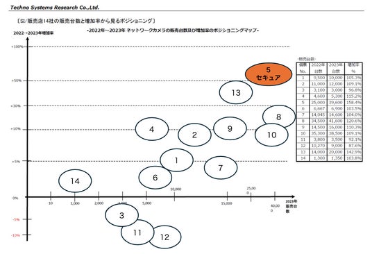 SI/販売店14社の販売台数と増加率から見るポジショニング 出典「2023年版 ネットワークカメラ国内市場のマーケティング分析」 ※社名を伏せるためにセキュアが一部改変
