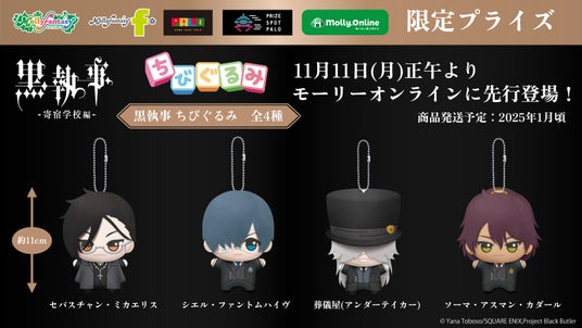 『黒執事 -寄宿学校編-』の「ちびぐるみ」がプライズに登場 セバスチャン、シエル、葬儀屋(アンダーテイカー)、ソーマのちびぐるみが11月11日(月)正午よりモーリーオンラインにて先行展開開始