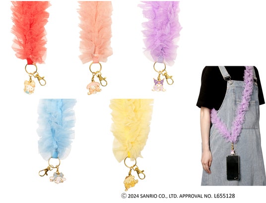 ボリューム感のあるチュールフリルに、リボンモチーフのキャラクターチャームがついた首掛けストラップ。「ポムポムプリン」、「クロミ」、「マイメロディ」、「ハローキティ」、「シナモロール」の全5種類。推しキャラ、推しカラーをGETして一緒にお出かけしよう!