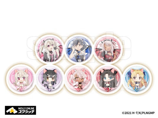 ネコ耳がかわいいデフォルメデザインのイリヤ、美遊、クロエ、凛、ルヴィアの缶バッジ。