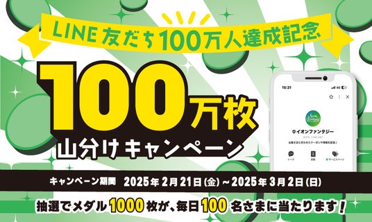株式会社イオンファンタジー(本社:千葉県千葉市、代表取締役社長:藤原徳也、以下、当社)が運営する「イオンファンタジーLINE公式アカウント」の友だち数が100万人を突破したことを記念して、2月21日(金)より「モーリーファンタジー」「PALO」をはじめとする当社のアミューズメント施設にて 「メダル100万枚山分けキャンペーン」を開催いたします。 本キャンペーンでは、当社アミューズメント施設内のメダルゲームコーナーで使用できるメダル1,000枚が、毎日抽選で最大100人に当たります。