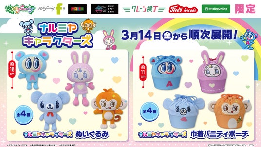 株式会社イオンファンタジー(本社:千葉県千葉市、代表取締役社長:藤原徳也、以下、当社)は、株式会社ナルミヤ・インターナショナル(本社:東京都港区、代表取締役執行役員社長:國京紘宇)が展開する、平成の小学生に人気のオリジナルブランド「ANGEL BLUE(エンジェルブルー)」、「mezzo piano junior(メゾピアノ ジュニア)」、「pom ponette junior(ポンポネット ジュニア)」、「DAISY LOVERS(デイジーラヴァーズ)」のオリジナルキャラクターたちのプライズゲーム用景品「ナルミヤキャラクターズ ぬいぐるみ」と「ナルミヤキャラクターズ 巾着バニティポーチ」を、「モーリーファンタジー」「PALO」をはじめとするアミューズメント施設において3月14日(金)より順次展開いたします。