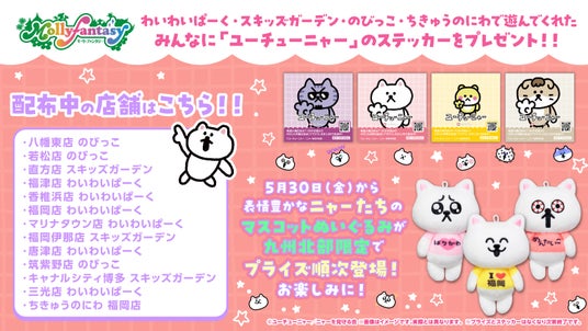 株式会社イオンファンタジー(本社:千葉県千葉市、代表取締役社長:藤原徳也、以下、当社)は、KBC九州朝日放送「アサデス。KBC」内で放映のTVアニメ『ユーチューニャー』のプライズゲーム用景品「ユーチューニャー ニャーのマスコットぬいぐるみ ご当地Tシャツ-九州Ver.-」を、九州北部地方限定(一部山口県内店舗も含む)で「モーリーファンタジー」等のアミューズメント施設において5月30日(金)より順次展開いたします。