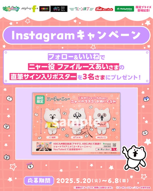 プライズ用景品の展開を記念し、モーリーファンタジー公式X・Instagram、ユーチューニャー公式SNSでは「ファイルーズあい様 直筆サイン入りポスター」が抽選で各3名さまに当たるSNSキャンペーンを開催いたします。詳細は公式アカウントをご確認ください。