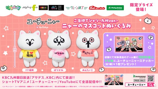KBC九州朝日放送「アサデス。KBC」内で放映のTVアニメ『ユーチューニャー』のぬいぐるみマスコット第二弾が、九州北部地方限定でモーリーファンタジー等に登場します。『ユーチューニャー』に登場する動画チャンネル配信ネコの「ニャー」が、かばんなどにつけて一緒に連れて歩ける手のひらサイズのマスコットぬいぐるみになりました。「I(ハート)福岡」「ばりかわ」、「めんたいこ」の九州のご当地Tシャツを着た表情豊かな「ニャー」のぬいぐるみマスコット全3種類を展開いたします。