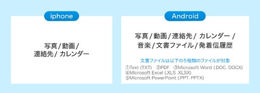 写真や動画はもちろん、連絡先、カレンダーもバックアップできます。 Androidでは、音楽、文書ファイル、発着信の履歴も保存が可能です。