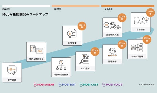 モビルスでは、これまで「MOBI AGENT(モビエージェント(R))」「MOBI BOT(モビボット(R))」をはじめとしたモビシリーズや、PCI DSSに準拠したセキュア・コミュニケーション機能「Secure Path(R)(セキュアパス)」の開発・運用を通して、コンタクトセンターの業務効率化に取り組んできました。2023年11月の「MooA-音声認識」提供開始以降も継続的に新機能をリリースしています。