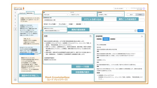 「MooA CommNavi」での「MooA KnowledgeBase」操作画面イメージ(通話中の文字起こし、絞り込み、追加指示、質問の意味検索、回答トーク支援、回答根拠の提示)