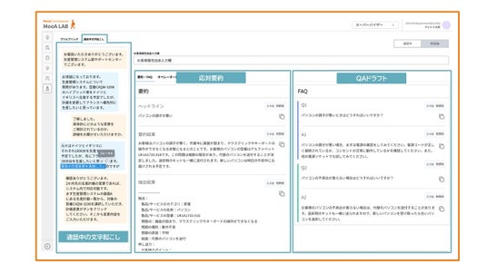 「MooA CommNavi」での操作画面イメージ(通話中文字起こし、応対要約、QAドラフト生成など)