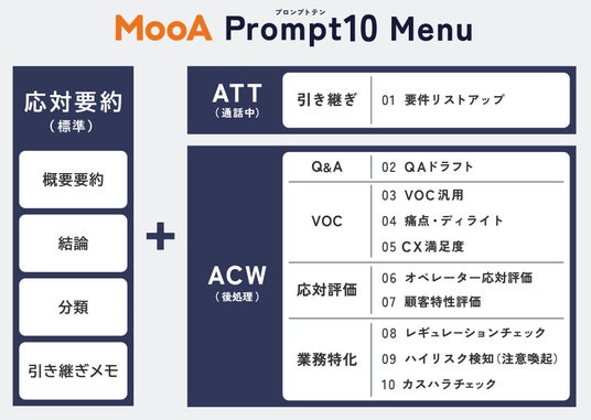 従来提供しているMooAの応対要約(概要要約、結論、分類、引継ぎメモ)に加えて、「MooA CommNavi」の要約メニュー MooA Prompt10(プロンプトテン)を利用することで、応対業務の効率化やオペレーターの経験に依存しない応対品質の均一化を実現します。