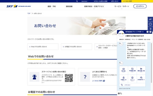 スカイマークのWebサイト上で、チャットボットとオペレーターによるチャットサポートサービス「SKYMARK