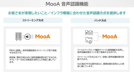生成AIでの要約(音声認識機能)にはストリーミング方式とバッチ(アップロード)方式があります。一般的にはACWの音声文字起こしおよび要約の出力では、ストリーミング方式が用いられますが、状況によってはアップロード方式が適切なケースもあり、導入先の環境に応じた方式に適用していく必要があります。また、コンピューターと電話等を連携させるシステム(CTI)など、コンタクトセンターで既に稼働している各システムと「MooA」との連携も導入時の検討課題の一つです。