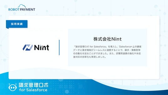 株式会社ROBOT PAYMENT(本社:東京都渋谷区、代表取締役:清久 健也、証券コード:4374、以下「ROBOT PAYMENT」)は、請求・債権管理システム「請求管理ロボ」を導入した株式会社Nint(本社:東京都新宿区、代表取締役:吉野順子、以下「Nint」)の導入事例を公開したことをお知らせします。