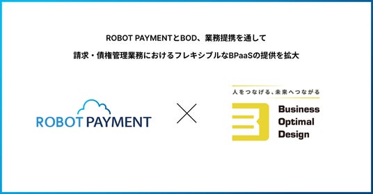 株式会社ROBOT PAYMENT(本社:東京都渋谷区、代表取締役:清久 健也、証券コード:4374、以下 当社)は、アウトソーシングサービスを提供する株式会社 BOD(本社:東京都豊島区、代表取締役:田中大善、以下 BOD社)との業務提携を行います。BOD社の提供するアウトソーシングサービスを、当社の提供する請求・債権管理業務を管理・統合・自動化するシステムに組み込み、請求・債権管理業務におけるフレキシブルなBPaaSの提供を拡大します。
