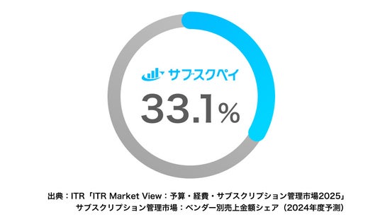サブスクリプション管理システム「サブスクペイ」は、2025年4月にITRが発行した市場調査レポート「ITR Market View:予算・経費・サブスクリプション管理市場2025」において、2024年度予測 サブスクリプション管理市場のベンダー別売上金額推移およびシェア1位を獲得しました。2022年度より引き続き3年連続でシェア1位となる見込みです。