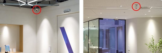 (左)受付に設置されたカメラ/(右)外部との出入口に設置されたカメラ