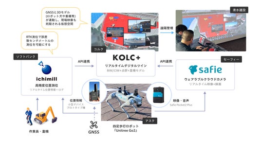 映像・画像情報に加え工事現場全体の状況をより詳細に把握するために、清水建設、コルク、ソフトバンク、アスク、セーフィーが連携し、施工現場のデータを仮想空間にリアルタイムで再現する「リアルタイムデジタルツイン」を導入しました。BIM/CIMクラウド「KOLC+(コルクプラス、※1)」で構築した現場のデジタルツイン上に重機や作業員の3Dモデルを配置し、ソフトバンクの高精度測位サービス「ichimill(イチミル、※2)」で取得した誤差数センチメートルの位置情報と3Dモデルを連動させることで、リアルタイムな現場3Dを実現しました。さらに、ウェアラブルクラウドカメラ「Safie Pocket2 Plus(セーフィー ポケット ツー プラス、※3)」のリアルタイム映像を現実空間と同じ位置でデジタル空間上に配置させることで、視覚的に現場の状況が確認しやすくなりました。これらの技術により現場での重機や作業員の正確な動きや位置情報をリアルタイムに把握し、現場に行かなくても施工の進捗や安全状況を確認することで、迅速な意思決定が可能になります。