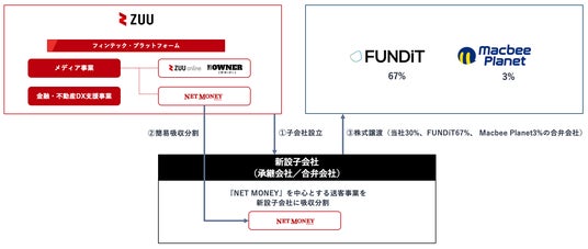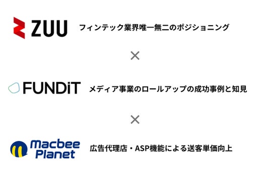 株式会社ZUU(本社:東京都目黒区、代表取締役:冨田和成、以下「当社」)は、2024年11月14日開催の臨時取締役会において、『NET MONEY』を中心とする送客事業(アフィリエイト)の事業成長を目的に、株式会社FUNDiT(本社:東京都港区、代表取締役:廣瀬 寛、以下「FUNDiT」)及び株式会社Macbee Planet(本社:東京都渋谷区、代表取締役社長:千葉 知裕、以下「Macbee Planet」)と合弁会社の設立を決議いたしましたので下記の通りお知らせいたします。