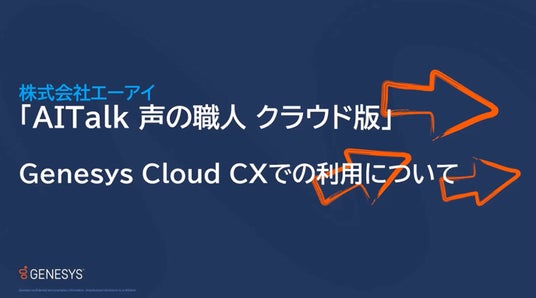 「Genesys」は、世界有数のコンタクトセンター・クラウド・プラットフォームである、Genesys Cloud CXを提供しています。 エーアイの音声合成エンジン「AITalk(R)」は、電話の応答メッセージやIVRのガイダンス音声として、多くの企業にご活用いただいております。 今後、Genesys Cloud CXとAITalk(R)ソリューションの機能連携を目指して、AppFoundry ISVパートナー契約を締結いたしました。 これにより、電話応答メッセージの品質に対する要求度が高い日本市場において、高品質でコントローラ ブルな「AITalk(R)」を、 Genesys Cloud CXをご利用のお客様にもご提供できるよう、連携を推進してまいります。 この契約に先駆け、エーアイの「AITalk(R)声の職人クラウド版」上で作成した音声ファイルを、 Genesys Cloud CXの音声ガイダンスとして設定するための案内動画が公開中です。下記ご覧ください。 「AITalk(R)声の職人クラウド版」Genesys Cloud CXでの利用について