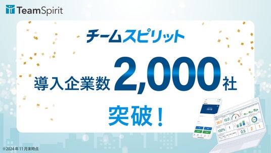 株式会社チームスピリット(本社:東京都千代田区、代表取締役CEO:道下和良、以下チームスピリット)は、勤怠管理や工数管理などのバックオフィス業務のDX化を支援するクラウドサービス「チームスピリット」をはじめとする提供サービスの導入企業数が、2024年11月末時点で2,000社55万ユーザーを突破したことをお知らせいたします。