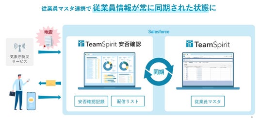 「TeamSpirit」シリーズをご利用いただいているお客様には、「TeamSpirit」シリーズの従業員マスタと自動連携するため、安否確認システム側での従業員データのメンテナンスが不要となります。さらに毎日使う「TeamSpirit」シリーズと組み合わせていただくことで、緊急時に社員がログインできないといった問題が生じません。
