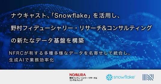 次世代金融インフラの提供を通して組込型金融を実現するFinatextグループの株式会社ナウキャスト(本社:東京都千代田区、代表取締役CEO:辻中 仁士、以下「ナウキャスト」)は、Snowflake合同会社(所在地:東京都中央区、社長執行役員:東條 英俊、以下「Snowflake」)が提供するAIデータクラウド「Snowflake」を活用し、野村フィデューシャリー・リサーチ&コンサルティング株式会社(本社:東京都中央区、代表取締役社長:荻島 誠治、以下「NFRC」)の新たなデータ基盤「DataHub」を構築しました。これによりNFRCが有する多種多様なデータを名寄せして統合、可視化し、生成AIによる高度な分析を通じてNFRCの業務効率化を支援します。