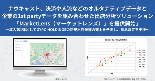 次世代金融インフラの提供を通して組込型金融を実現するFinatextグループの株式会社ナウキャスト(本社:東京都千代田区、代表取締役CEO:辻中 仁士、以下「当社」)は、クレジットカード決済データや人流データなどのオルタナティブデータと企業のマーケティングデータを組み合わせた出店分析ソリューション「MarketLens(マーケットレンズ)」の提供を開始しました。導入第1弾として、GYRO HOLDINGS株式会社(本社:東京都新宿区、代表取締役:根本 寿一、以下「GYRO」)の新規出店候補の売上を予測し、新規出店判断の意思決定支援を開始しました。