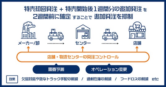 これらの課題を解決するため、「特売LT長期化サービス」では、各特売の特徴や店舗ごとのチラシ、陳列方法を考慮した需要予測技術を活用し、小売業に対し、初回発注と同時に特売開始後1週間分の追加発注を特売開始2週間前に提案・確定します。これにより、特売期間中の追加発注を抑制し、メーカーや卸売業における欠品対応や過剰在庫の削減を実現しました。