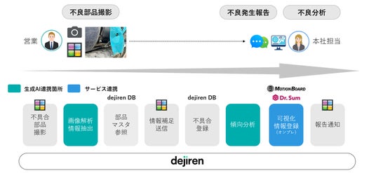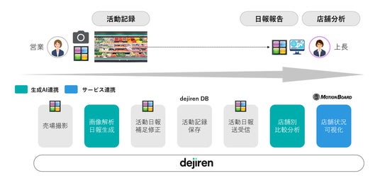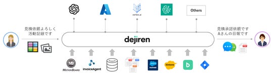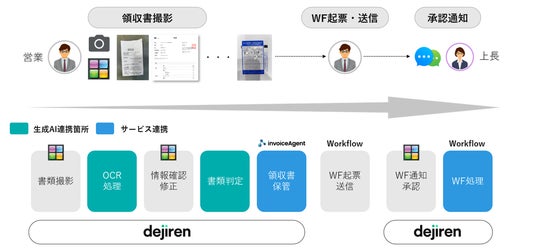 主要製品全てに生成AIを適応し、AIプラットフォーム「dejiren」を新たに提供。経費精算、活動報告など帳票業務の自動化を実現