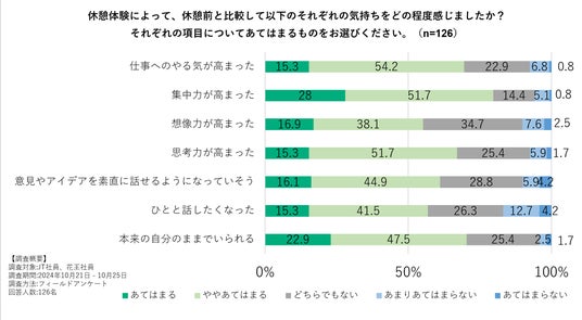 花王とJTの従業員計126名に対し、「心とからだが休まる休憩体験」後に実施したアンケートで休憩体験前後の仕事に関する気持ちの変化について聞いた質問では、【仕事へのやる気が高まった】や【意見やアイデアを素直に話せるようになっていそう】など全ての項目に対して半数以上が「あてはまる」「ややあてあまる」と回答する結果となりました。