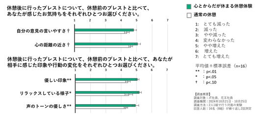 通常の休憩と比較して「心とからだが休まる休憩体験」では「対人的好感情」が向上。相手から見てもリラックスしており、優しい印象を持たれる結果に。