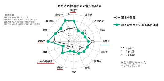 検証には、花王感覚科学研究所が開発した快適感を構成する16種類の感情を測定する方法を用いています。その結果「心とからだが休まる休憩体験」後では、通常の休憩後と比較して【対人的好感情】のほか、【感動】【満足】【安静】【爽快】といった感情が有意に高くなりました。