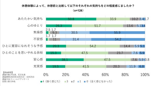 また花王とJTの従業員計126名に対し「心とからだが休まる休憩体験」後に実施したアンケートでは、休憩体験前後での気持ちの変化として【心のゆとり】を感じた人が78%、【安心感】を感じた人が85.6%と、休憩体験により心のゆとりや健やかさが生み出されたと考えられます。同時に、【ひとに 寛容になれそうな予感】を感じた人が74.5%、【ひとのことを思いやれる余裕】を感じた人が62.8%と対人的好感情・親和性の変化も見られました。