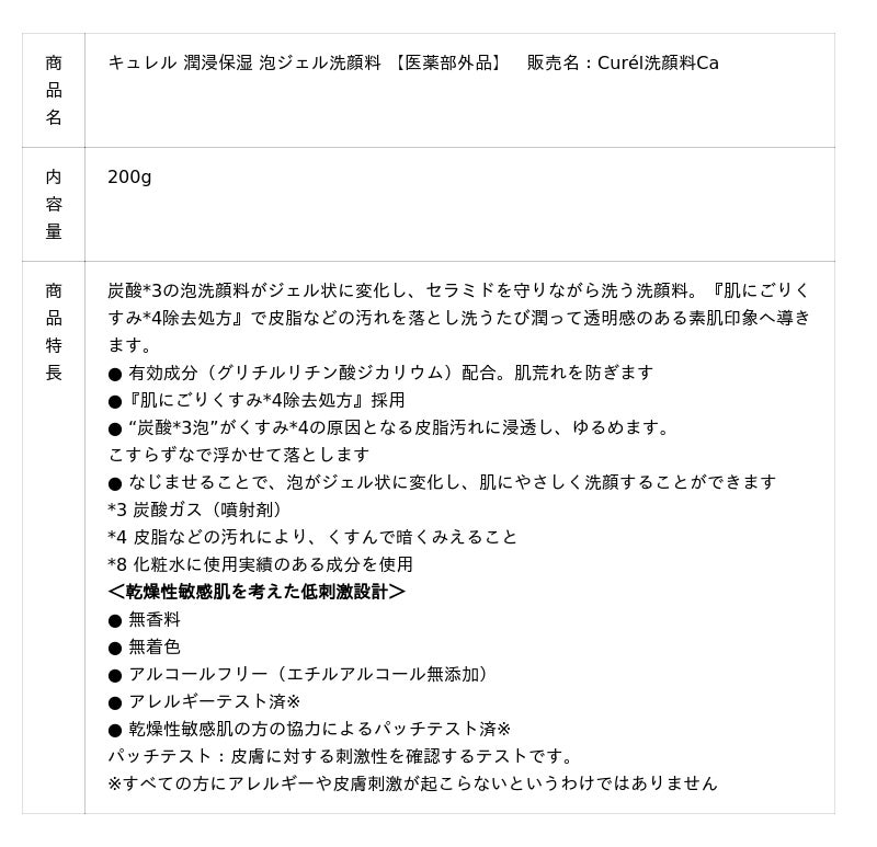 一方、『キュレル 潤浸保湿 泡ジェル洗顔料』は、「肌にごりくすみ*4除去処方」を採用。炭酸*3泡がくすみの原因となる皮脂などの汚れに浸透し、ゆるめます。なじませることで、泡がジェル状に変化し、肌に負担なく汚れを浮かせて落とすことができます。また、化粧水成分100%*8の洗顔料で、洗うたび潤って透明感のある肌印象へ導きます。