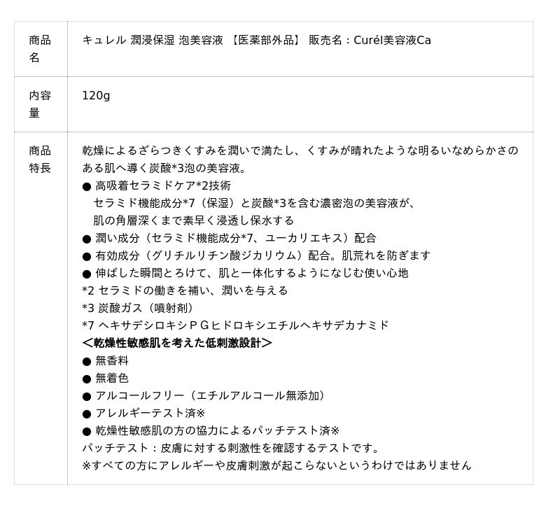 『キュレル 潤浸保湿 泡美容液』は、高吸着セラミドケア*2技術を採用しており、セラミド機能成分*7(保湿)と炭酸*3を含む濃密泡の美容液が肌の角層深くまですばやく浸透し保水します。また、乾燥によってキメの乱れた肌の奥(角層)まで浸透し潤いを与え、くすみが晴れたような明るいなめらかな肌に導きます。