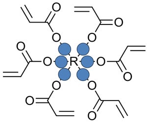 UV硬化樹脂材料の中でも光硬化性の高い多官能モノマーは、優れた機械物性を持つ硬化膜が得られるため幅広く使用されています。一方、汎用的な多官能モノマーは粘度が高いため、有機溶剤や低粘度のモノマーで希釈して使用されることが多く、環境面や性能面での課題※1があります。