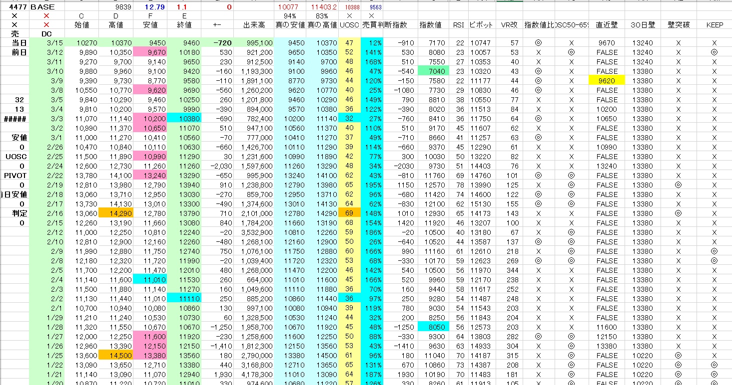 この株、先週末に奪還した短期の壁に突き戻されました。オシレーター値も40%台へと逆戻りで-5%の47%。但し、今日は押されすぎましたので、その反動から明日は少し上げにかかるかも知れませんが、まだ本復状態には遠い感じ。何せ、ボリュームレシオが50%台と低迷中。過去のデータを見ても、この指標が三桁に乗せないと上昇はきつい。