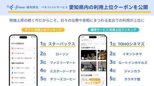 フリー株式会社(本社:東京都品川区、CEO:佐々木大輔、以下「freee」)は「#第3の賃上げ 愛知アクション」始動に伴い、freee福利厚生 ベネフィットサービスの愛知県内のクーポン利用ランキングを公開しました。