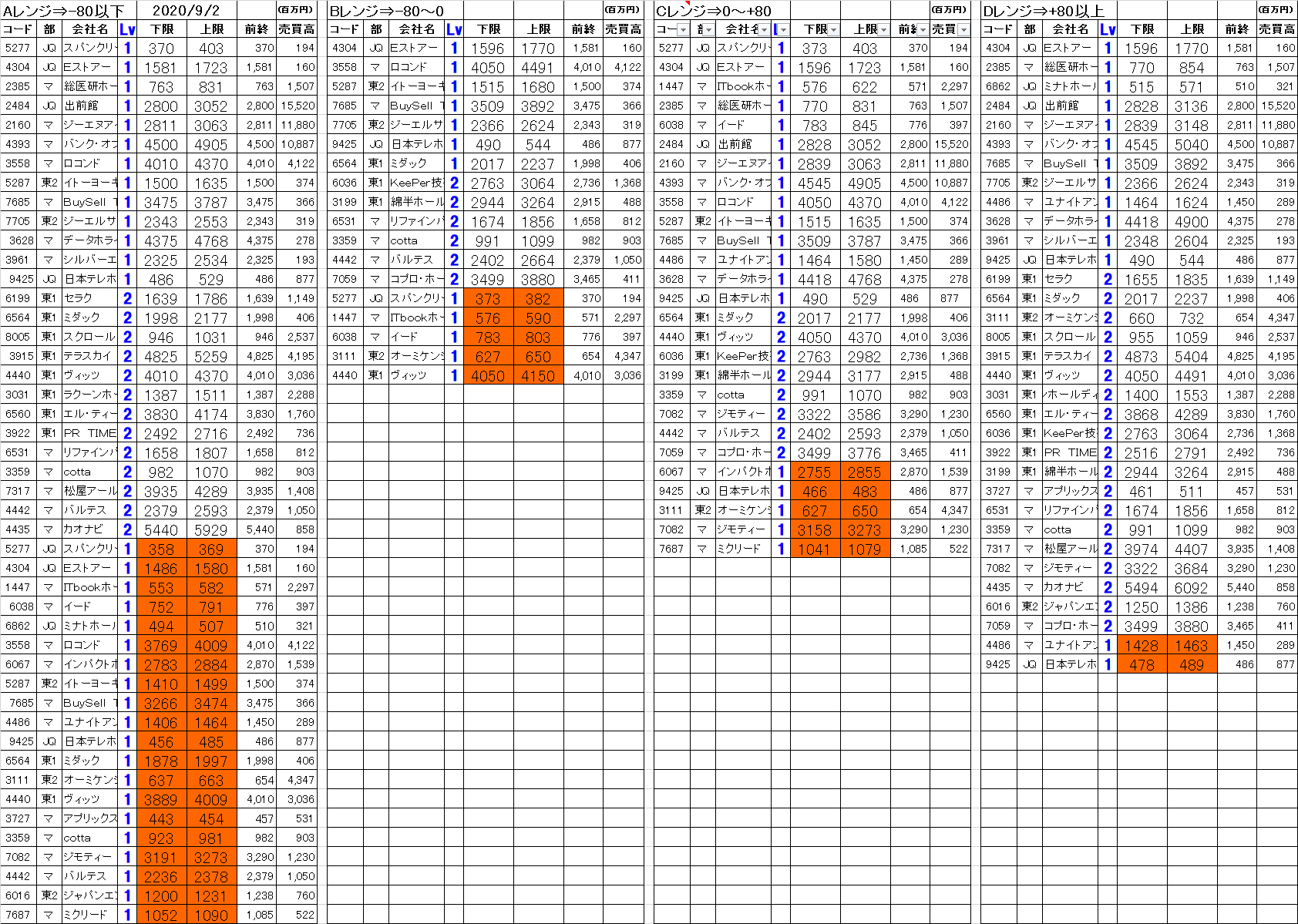 2020/9/2(水曜日) 今日のシステムトレードの仕掛候補一覧です。今日の日経の寄り付きはDレンジでした仕掛表の各レンジは日経平均の前日終値比で以下のよう... ...続きを読む