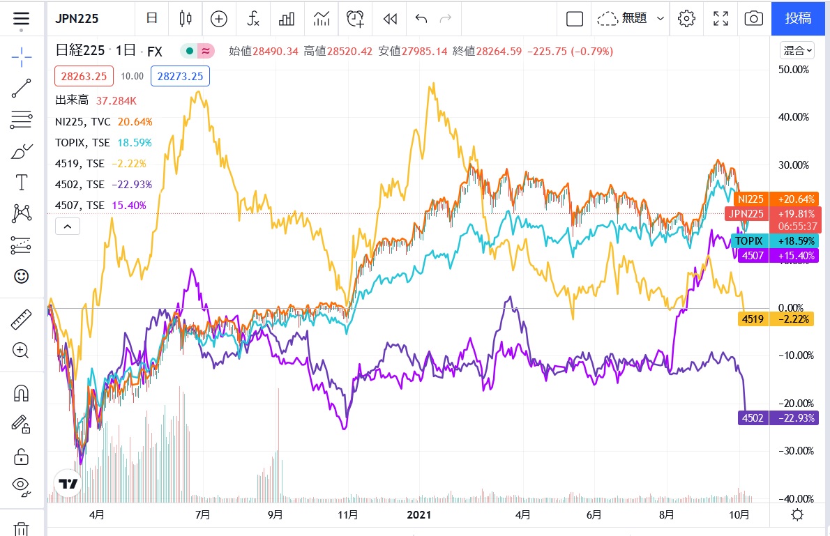 途中でコロナ関連(抗体カクテル等)の要素で株価が上下したが今はなくなり素の状態だと考える。