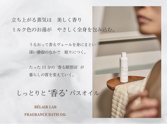 ロート製薬株式会社(本社:大阪市、社長:杉本雅史)が運営をする香りと感性の研究所「BELAIR LAB(ベレアラボ)」から、初のボディケアアイテム「フレグランスバスオイル」を2024年11月20日(水)より公式オンラインストア限定で発売いたします。天然植物オイル*に、心地よい睡眠を演出する香りをブレンドした美容オイルのような入浴液で、お風呂に入るだけでしっとりとした肌を実感でき、バスルームに広がる香りと、湯上りのほのかな残り香をお楽しみいただけます 。乾燥と忙しさが重なる秋冬だからこそ、1日15分の自分へのご褒美として「香る瞑想浴」を取り入れ、手間なく心・身体・肌が喜ぶ時間を過ごしてはいかがでしょうか。