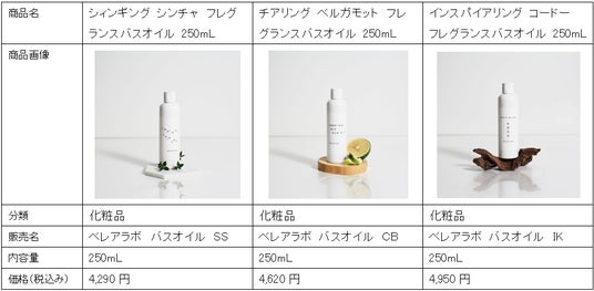 そこでベレアラボは、入浴による温浴効果に加え、肌への美容効果(うるおい)と、香りや色、質感などの感性価値を付加した入浴剤として「フレグランスバスオイル」を開発。空間に深い静寂をもたらし心地よい睡眠を演出する3つの香りをセレクトし、普段のバスルームをくつろぎの場所へとグレードアップ。肌と眠りのための新習慣として、1日15分間の「香る瞑想浴」を提案します。