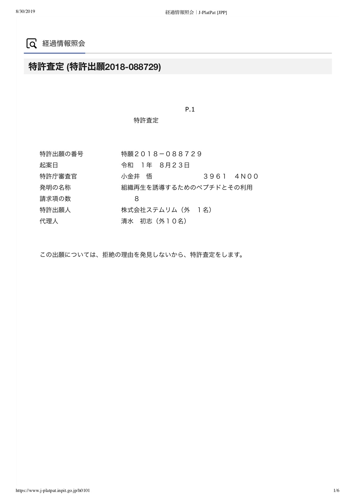 28日付で、ステムリムの特許申請が審査パス!!の事実を発見。