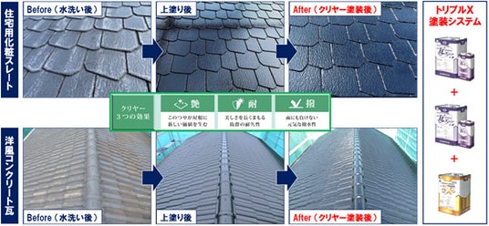 Sun瓦トリプルX仕様(Xワンシーラー+Xトップ上塗+XトップクリヤーAUV)は強靭な複層架橋塗膜構造とAUV(耐紫外線)効果により、当社従来仕様比で、つやが約1.5倍長持ちし、色あせを防ぎます。また、従来のSun瓦Xトップに本製品を塗装することによりフッ素塗料クラスの高耐候性を実現するため、Sun瓦トリプルX塗装システムをラインアップいただくことにより、お客様の在庫削減にも貢献します。