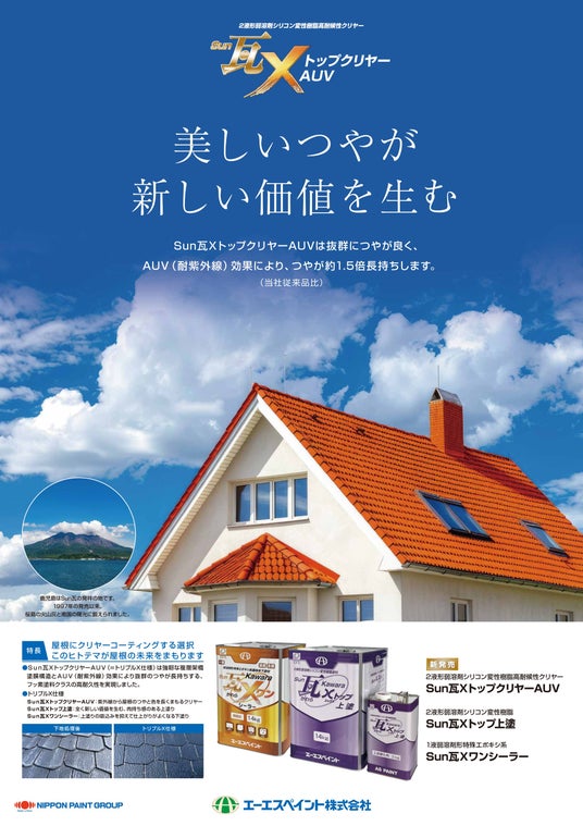 日本ペイント株式会社のグループ会社であるエーエスペイント株式会社(本社:愛知県豊明市、社長:大垣敦、以下、当社)は、2液形弱溶剤シリコン変性樹脂高耐候性クリヤー「Sun瓦XトップクリヤーAUV」(以下、本製品)を、2024年10月29日より全国発売開始いたしますのでお知らせします。本製品は、屋根材を長期にわたり強力に保護する窯業系屋根材塗り替え時の仕上げ用クリヤー塗料で、「Sun瓦Xトップ」専用製品です。