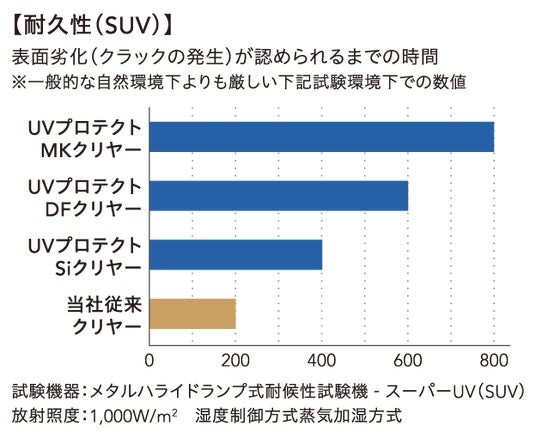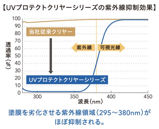 紫外線は人の健康や環境への影響度の観点から、波長によってUV-A(315~380nm)、UV-B(280~315nm)、UV-C(200~280nm)の3つに分けられます。この内、地表に届き私たちの生活に影響を与えているのは295nm以上の紫外線であり、皮膚など人体に悪影響を及ぼすように、塗膜の劣化を進めてしまいます。ピュアライドUVプロテクトMKクリヤーは、シリーズ最上位の耐久性で塗膜面の劣化を長期にわたり保護します。