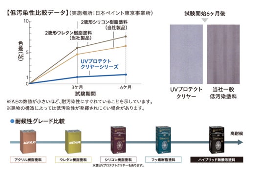 屋外に塗板をさらし、雨筋上の汚れのつく程度を色差(ΔE)で測定した結果、シリコン樹脂塗料やウレタン樹脂塗料と比べ、汚れの見え方が約6分の1に抑えられる結果となりました。