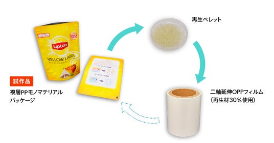 今回の実証試験では、リプトン・ティーアンドインフュージョン・ジャパン株式会社、TOPPAN株式会社、東洋インキが剥離脱墨可能な複層モノマテリアルパッケージの開発を行い、フタムラ化学株式会社が再生材を用いたフィルムの成型と物性評価を行いました。