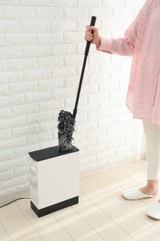 新商品『ケース付きモップクリーナー』は、お客様の声を受けて、フロアモップを収納するケースとモップクリーナーを一体化しました。一体化することで、省スペースで見た目がスッキリし、すぐに手に取りやすいリビングなどに置いて気軽にお掃除を始められるように配慮しました。さらに収納部には使ったモップをキレイにする「かきとりブラシ」と「吸引機能」がついており、モップを収納部に戻すついでに立ったままモップを簡単にキレイにして、毎回気持ちよくモップを使うことができます。ま